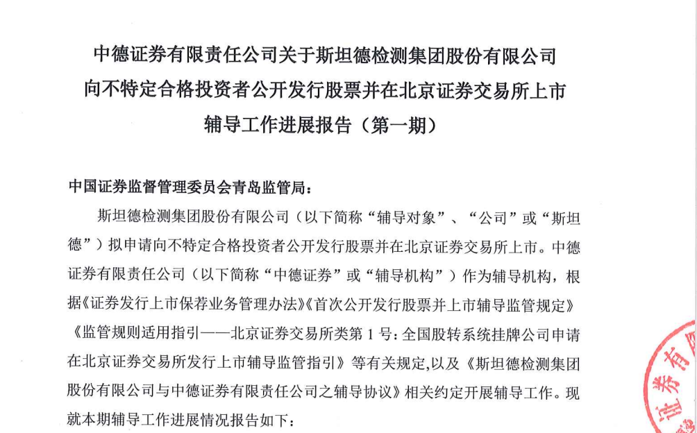 斯坦德检测集团股份有限公司(以下简称:斯坦德)董事会于7月14日发布公告,公告称该公司申请公开发行股票,并在北交所上市。